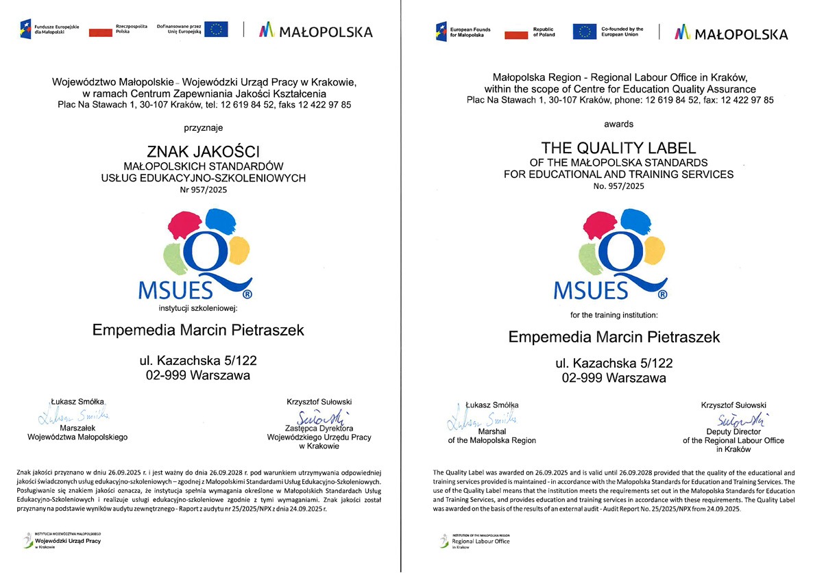 Informujemy, że firma Empemedia posiada Certyfikat Jakości MSUES – świadczący o spełnianiu wysokich standardów usług edukacyjno-szkoleniowych.